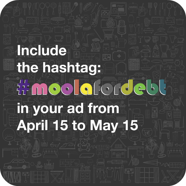Participants are eligible to receive a FREE Top Ad after posting 20 ads with the #moolafordebt hashtag. Additional Top Ads may be claimed after 35, 45 and 50 ads are posted! Email Promos@Used.ca to claim your Top Ad.
