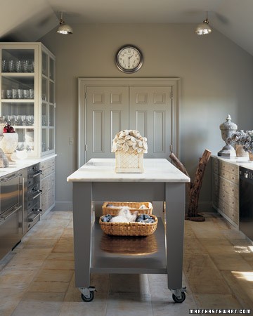 (This island from Martha Stewart’s Bedford kitchen shows what a simple frame can look like with some paint, casters, and a marble countertop)