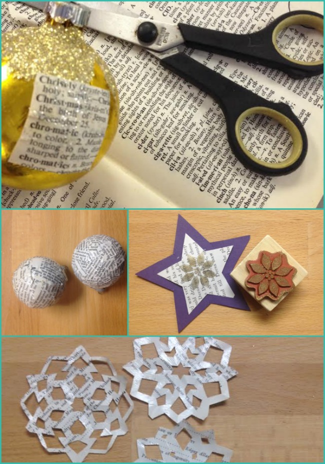 There’s lots you can do with old books. Our favourite Christmas craft with old books is to use cut small pieces of paper to cover old or damaged baubles. Use Mod Podge to make the paper stick and give a glossy look. We also made pretty stars and snowflakes that are so tiny and cute it hurts. Again, use Mod Podge to give a lovely gloss and to stiffen the snowflakes so they are easier to hang.